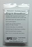 BB400 Solderless Plug-in BreadBoard, 400 tie-points, 4 power rails, 3.3 x 2.1 x 0.3in (84 x 54 x 9mm) Reviews - BreadBoard-400 is a solderless (plug-in) breadboard with 400 connection tie-points (i.e. 400 wire insertion holes). It has 4 power rails.Solderless breadboards are great for building and testing new circuits because parts can be easily inserted and removed. They are completely re-usable. The BB400 has a 300 tie-point IC-circuit area plus four 25 tie-point power rails. The housing is made of white ABS plastic, with a printed legend giving numbers and letters for columns and rows. The internal contacts are phosphor bronze with a plated nickel finish.A peelable adhesive tape backing is provided for attaching it to a surface.BPS BreadBoards are Lead-Free and RoHS Compliant. Finished projects can be moved to a SB400 Solderable PC BreadBoard to make them permanent.